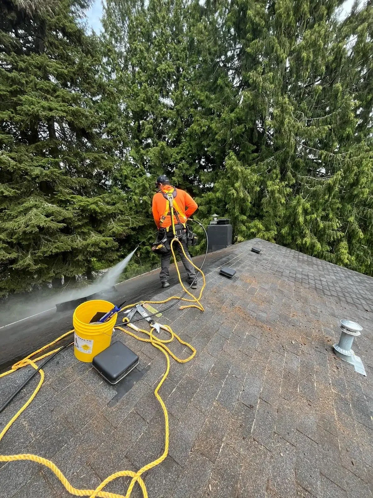 Insted of using power - pressure washing wich can damage your siding, we use a gentle softwash method with a specialized industrial solution. This effectively cleans your siding without causing any harm, leaving it looking fresh and well - protected.